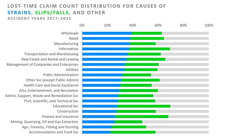 Understanding the causes of injury is critical to preventing them. According to NCCI data, the two leading causes of injury are strains at 32% and slips/falls at 27%, which together account for 59% of the lost-time claims.
